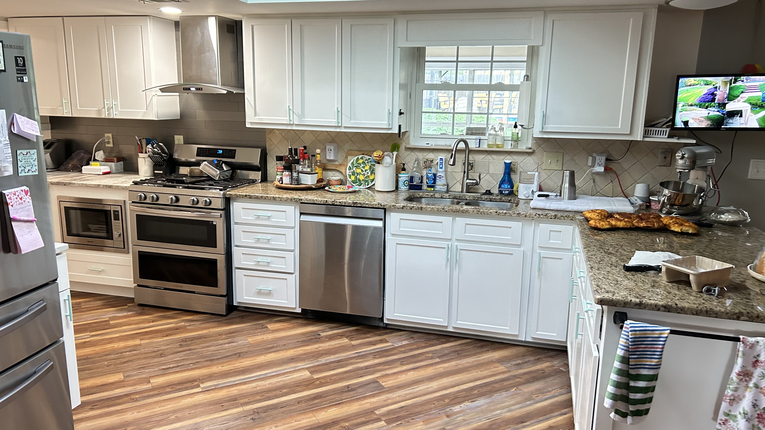 LTC Cabinetry completely revitalized the kitchen by refinishing the cabinets in crisp white, building new custom doors and drawers for a modern and seamless look. They installed a sleek stainless steel vent hood, paired with a sophisticated backsplash featuring a steel tile design, and added bright, durable countertops that elevate the space’s functionality and elegance. The transformation from the old brown cabinets to the new white ones is dramatic—what was once a dark, traditional kitchen now feels open, fresh, and contemporary, creating a brighter and more inviting atmosphere.